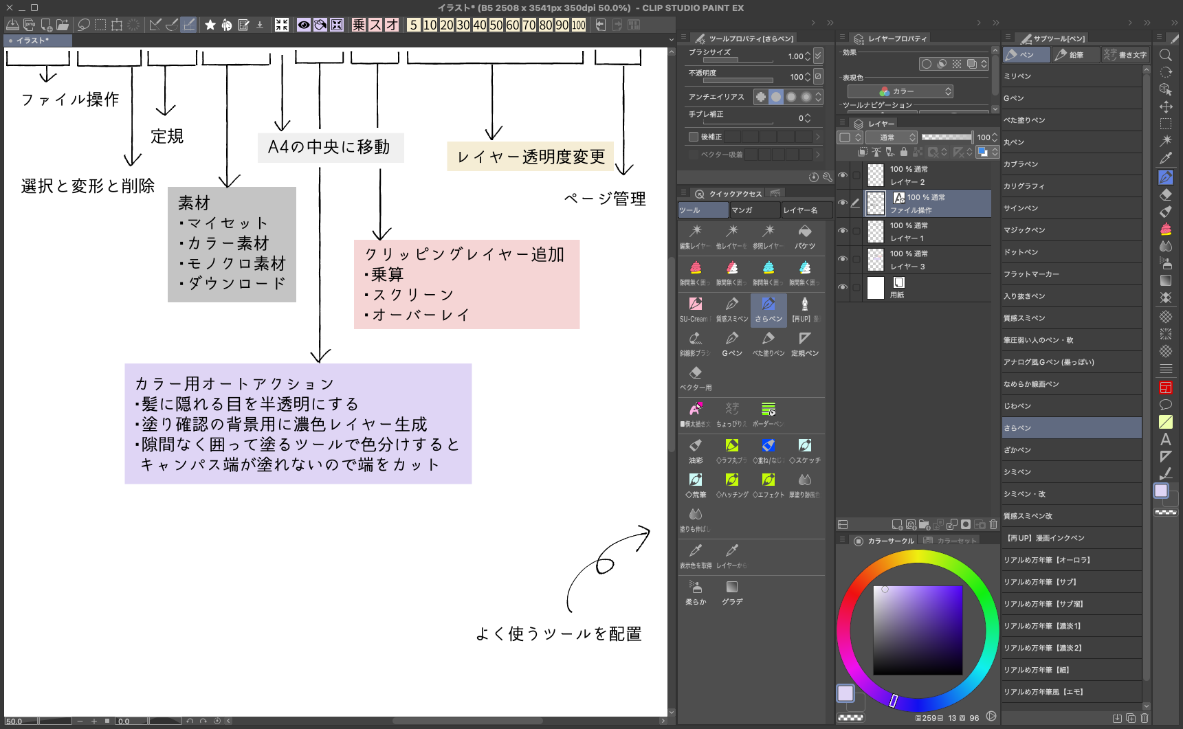 キャンパス操作系、Undo、ブラシサイズ、消しゴムといったよく使うツールをタブメイトに。そこそこ使うツールをクイックアクセスとコマンドバーに設定してます。