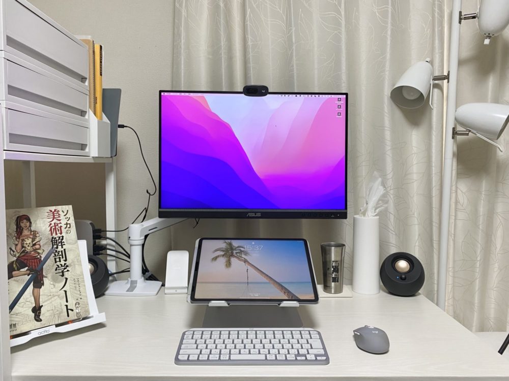 机の幅的にモニターとiPadとキーボードを置くと窮屈だったんですが、モニター下が空いたことで一気にスッキリしました。