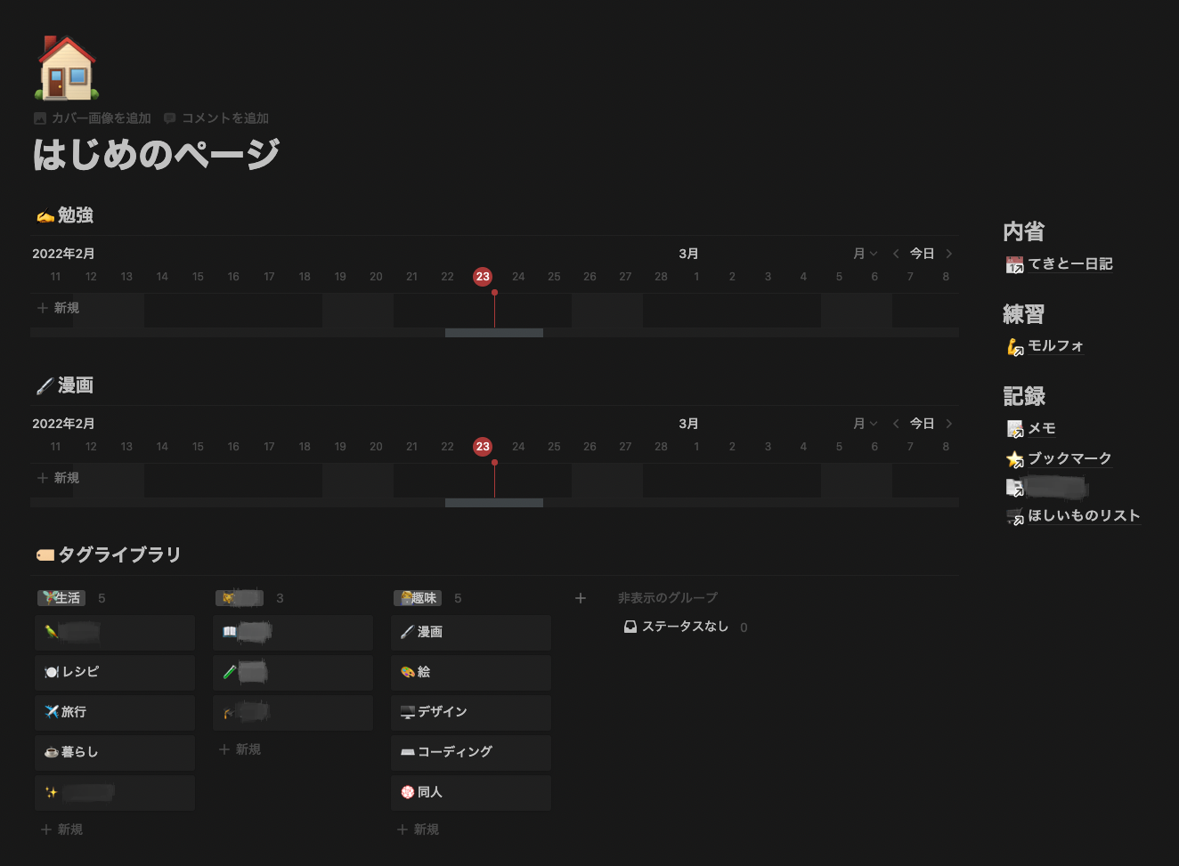 私はこんな感じでホームにまとめて置いておいて、長期タスク+各種情報に飛べるようにしてます。タグに各種情報を紐付けてまとめて表示できるようにしてます。